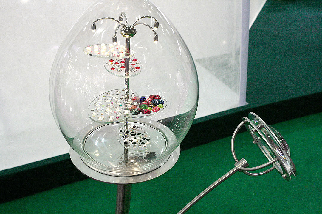 prostor k jednání obklopený skleněnými poupaty, uvnitř kterých je nainstalováno zboží