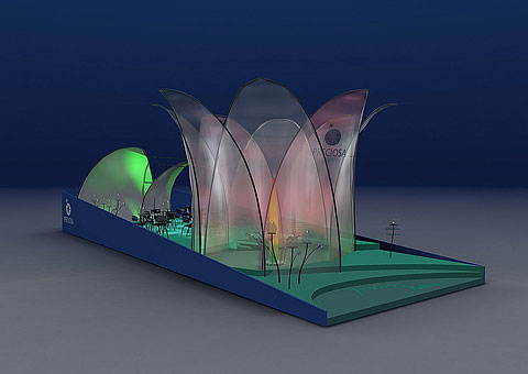 ústředním motivem expozice je čtyři metry vysoký květ, jehož vnitřkem se musí projít dále do stánku